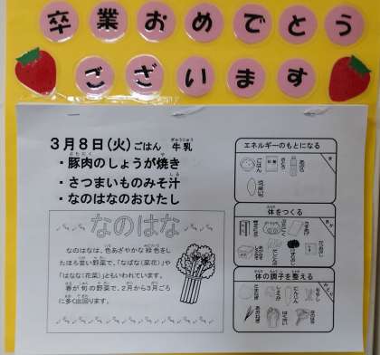 なのはなは、色あざやかな緑色をしたほろ苦い野菜で、「なばな(菜花)」や「はなな(花菜)」ともいわれています。春が旬の野菜で、2月から3月ごろに多く出回ります。今日も好き嫌いなくしっかりと食べてほしいと思います。