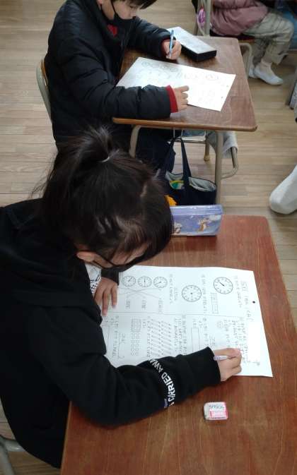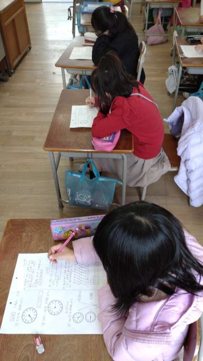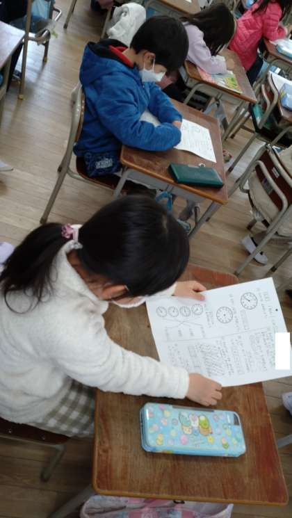学習のまとめをしました。これまで習った時計やたし算、ひき算などの課題に取り組んでいます。課題ができたらきちんと見直しをしています。