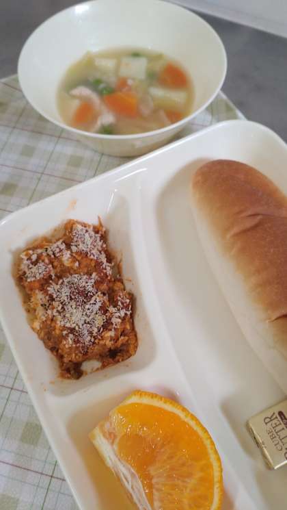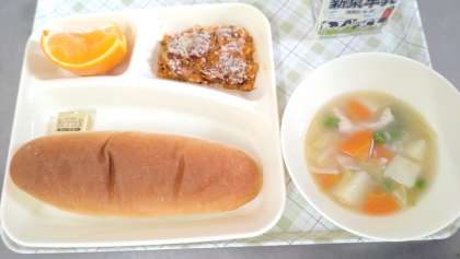 今日の給食は、とうふのミートグラタン、押麦と野菜のスープ煮、デコポン、パン、牛乳です。