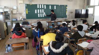 物語文「世界一美しいぼくの村」の学習をしました。前時に続き、主人公の人物像について短冊を使って話し合っています。