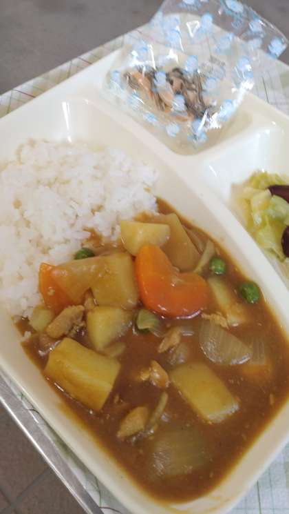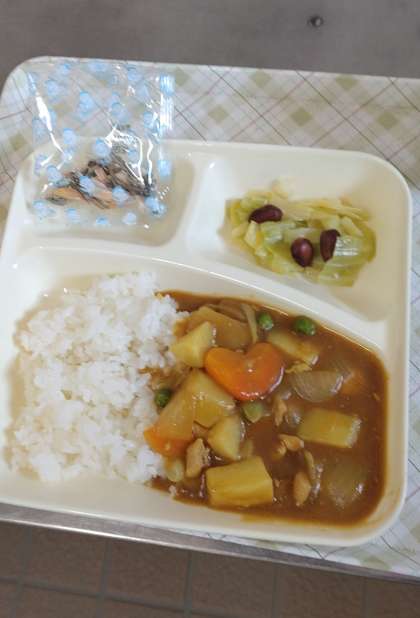 今日の給食は、チキンカレーライス、ビーンズサラダ、アーモンドフィッシュ、牛乳です。