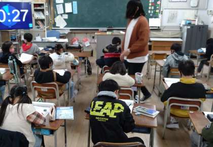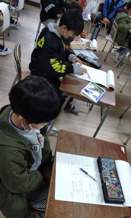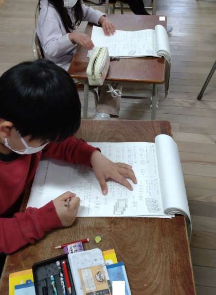 算数や国語ともに1年間学習したことを一冊のプリント集でまとめています。子どもたちはそれらの計算問題や文章問題などを熱心に取り組んでいます。