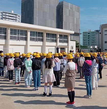 運動場で児童朝会が行われました。校長先生からは、生活目標についてのお話がありました。一日の終わりに、生活目標に書かれていることを守れたかどうかを振り返ることが大切だと話してくださいました。