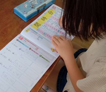 新出漢字の学習をしています。書き順を確かめて、丁寧にドリルに書いていました。