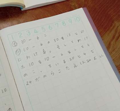 30−6の計算の仕方を考えました。自分がどのように考えたのか、わかりやすくノートに書くことができています。