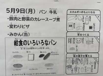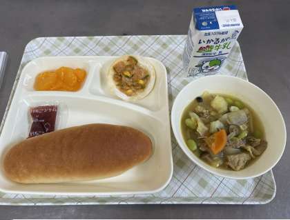 今日の給食は、豚肉と野菜のカレースープ煮、変わりピザ、みかん(缶)、パン、牛乳です。