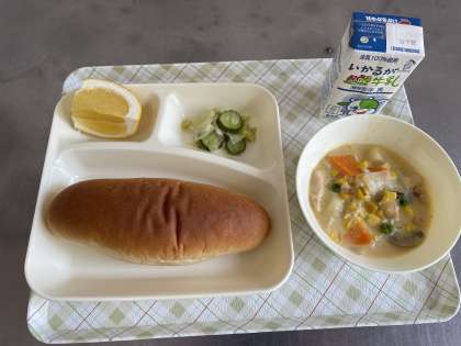 今日の給食は、コーンクリームシチュー、キャベツときゅうりのサラダ、かわちばんかん、パン、牛乳です。