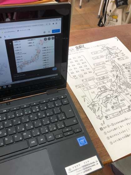 日本の山地、山脈、川の位置と名称を学習しています。一人一台端末を有効に活用しています。