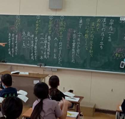 象形文字、指示文字、会意文字、形声文字をなど、漢字の成り立ちについて学習しました。