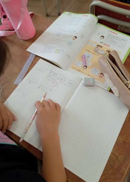 3桁の数のたし算・引き算のまとめに入っています。教科書の問題をノートにやりました。