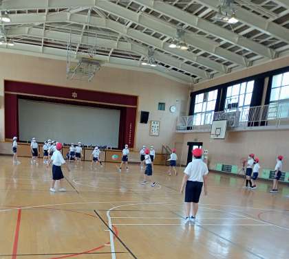 講堂でドッジボールをしました。6年生の投げる球はものすごく速いです。
