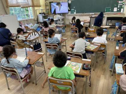 音楽の時間に、井高野小学校の校歌の歌詞を教科書に貼って、校歌を歌う練習をしました。