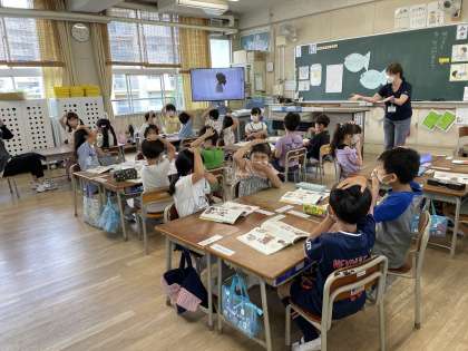 国語で「きいて つたえよう」の学習をしました。班の一人が先生の話を聞いて同じ動作を班の人に伝えて、先生の「どうぞ」の合図で聞いた動作をするという学習をしました。