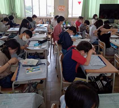 エプロンづくりをしています。みんな集中してしつけをしていました。
