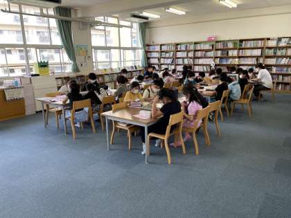 図書室で学校図書館司書さんの指導でおためし読書をしました。
