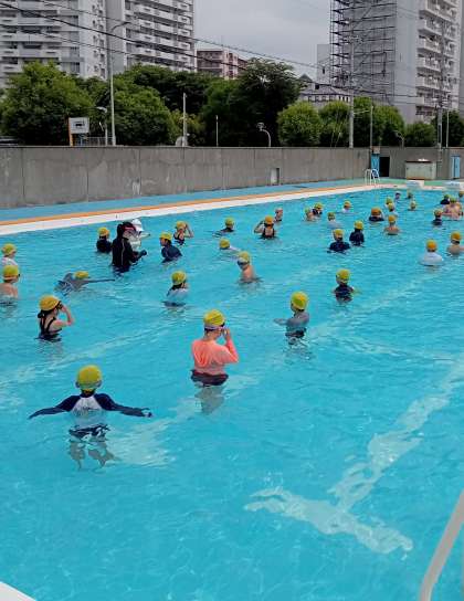 今日はプール開きの日です。一番始めは4年生がプールに入りました。