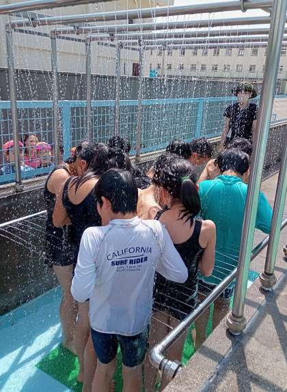 プールに入る前にシャワーを浴びます。