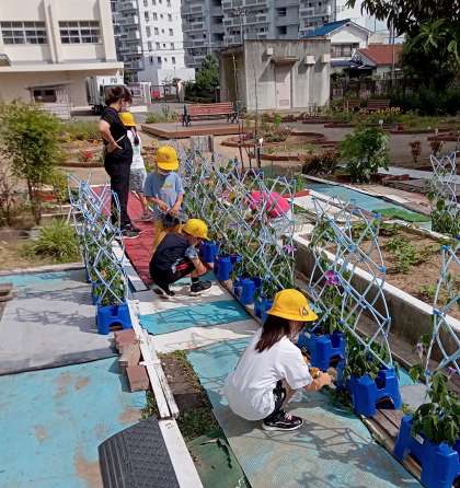 アサガオの水やりをしています。花が咲き始め、喜んでいる姿が見られました。