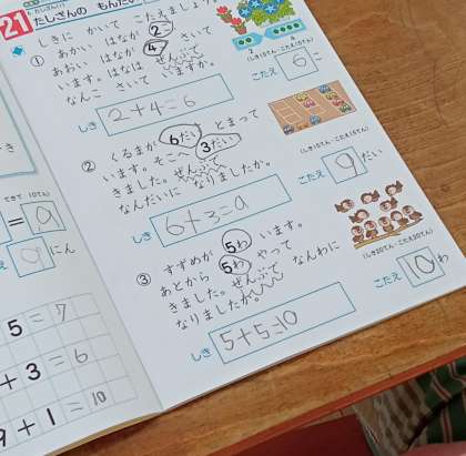 文章の問題に挑戦しています。文章の中の大事なところに印をつけて考えました。
