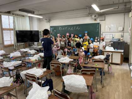 図画工作で「わっかでへんしん」の作品を身に着けて、みんなで記念写真を撮りました。