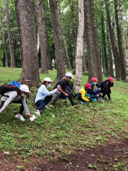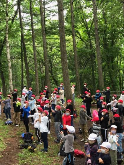 昼食をいただき、いよいよ高丸山を登ります。安全で怪我のないように、準備運動です。