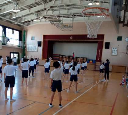 運動会の団体演技の練習をしています。