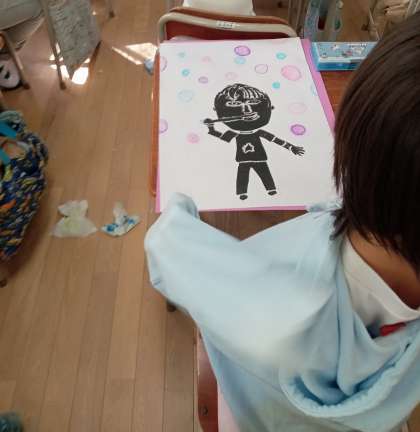 紙版画の作品に、パスを使ってシャボン玉を描きました。