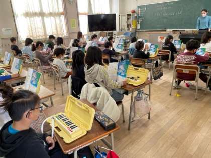 「いるかはざんぶらこ」の曲を歌ったり、鍵盤ハーモニカで演奏したりしました。