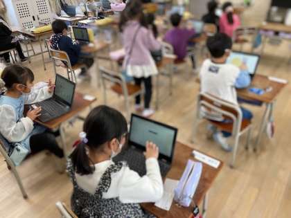 一人ずつ音楽のテストをしている間、一人一台あるタブレットで、絵をかいたり、調べたりして、パソコンに親しみました。