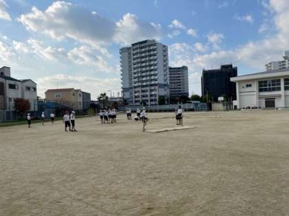 運動場で、走り高跳びをしました。はさみととびで高く飛ぶ学習をしました。