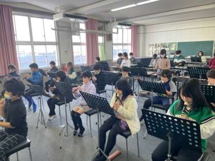 それぞれの楽器のパート練習した後のはじめての合奏をしました。音の重なりがきれいで、うまく合奏ができていました。