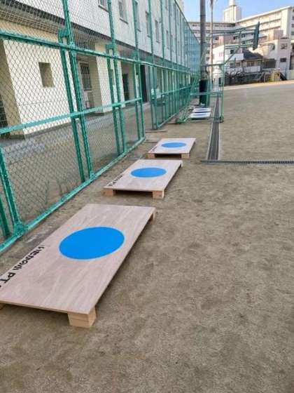 児童集会の時に、ジャンピングボードのお披露目をしました。ジャンピングボードは、その上でなわとびを練習するための道具です。管理作業員さんが6台作ってくれました。材料費をPTAの予算から支出していただきました。これから、たくさんの児童になわとびの練習をしてもらいたいと思います。
