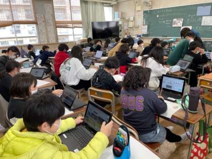 図画工作で木版画をしました。一人一台端末で動物の画像を検索して木版画の図柄を選んでいます。