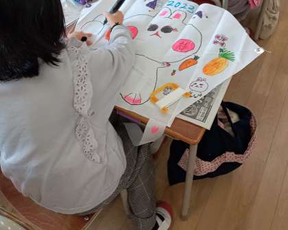 たこを作りました。みんなそれぞれ、たこに好きな絵を描きました。