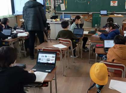 外国の食べ物についてタブレットを使って調べ、まとめています。