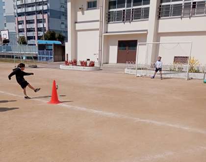 サッカーをしています。ゴールに向かって力強くシュートしていました。