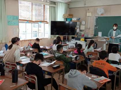 「水平線」という詩を学習しています。水平線によって空と海の境目がはっきりとわかれている様子を読み取りました。