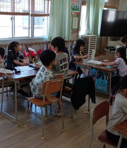 今日は1年生と一緒に学校探検をしました。探検が終わってから教室で、自分たちの行動の振り返りをしました。