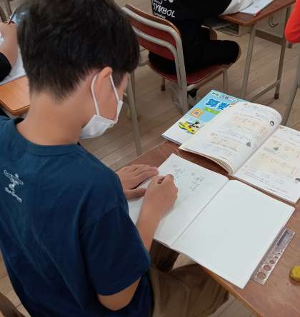 わり算の筆算に取り組んでいます。繰り返し練習して、計算の手順を覚えていきます。