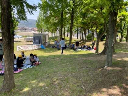 遠足で花園中央公園に行っています。みんなでお弁当を食べました。