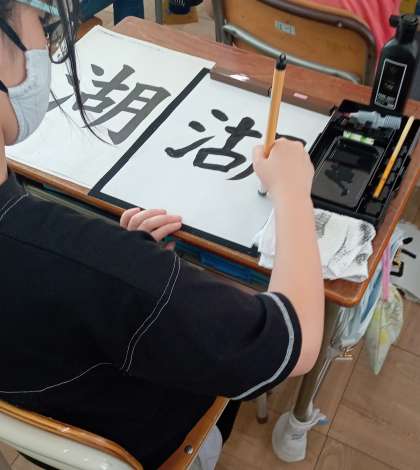 「湖」という字を書いています。全体のバランスを考えながら、お手本をよく見て書いていました。
