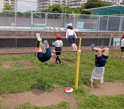 鉄棒運動をしています。難しい技にも積極的に挑戦していました。
