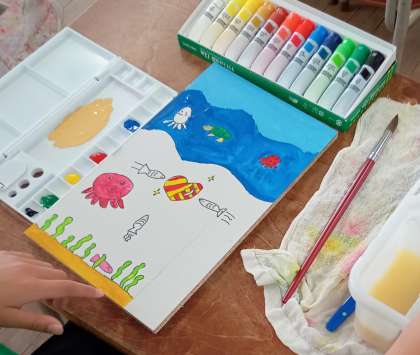 くぎ打ちゲームを作っています。土台となる板に絵を描いています。