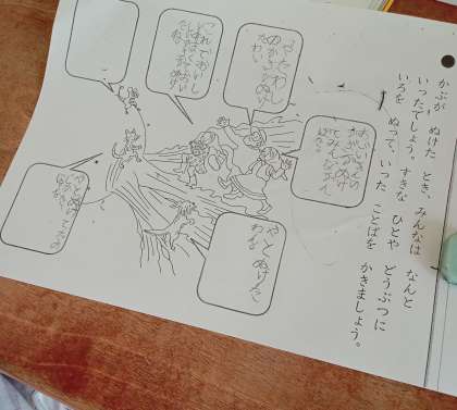 「おおきなかぶ」の学習です。やっとかぶがぬけたとき、みんなは何と言ったかを考えました。