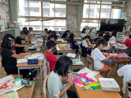 図画工作で「コロコロガーレ」をつくりました。ビー玉を転がすコースをつくる作品です。