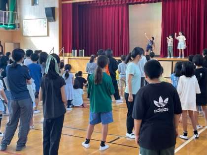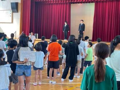 児童集会で幕と幕の間にものを投げて何が通ったかを当てるゲームを児童集会で集会委員がしてくれました。たのしいたてわり班での活動ができました。