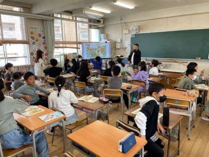 C-NETのネイティブの先生と一緒に外国語の学習をしました。アルファベットの形を手で作ってとなりの人とあてるゲームをしました。