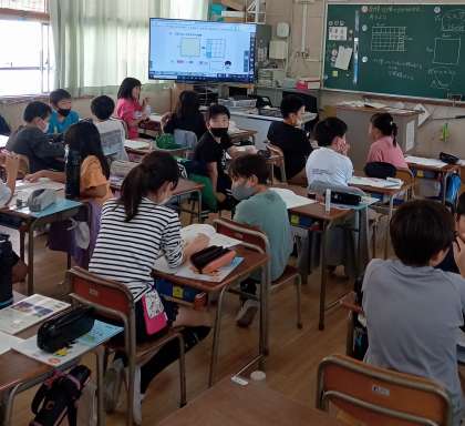 面積の学習をしています。1辺が4cmの正方形の面積はなぜ4×4でわかるのか、活発に話し合っていました。
