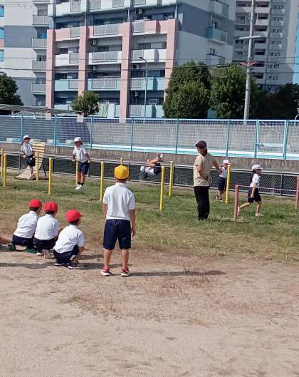 鉄棒をしました。先生の合図で技に挑戦しています。