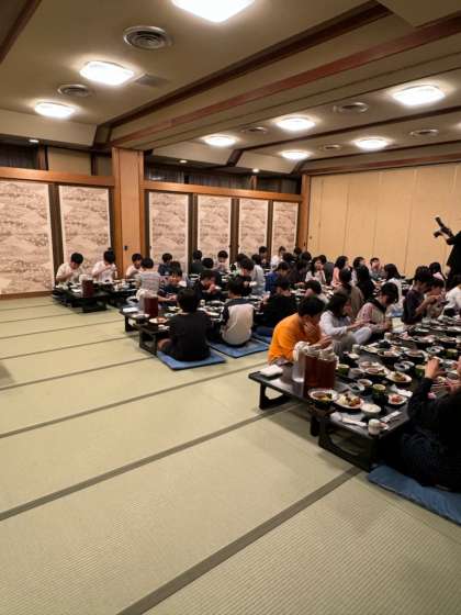 避難訓練、入浴を経て夕食の時間です。志摩スペイン村でしっかり活動したので、お腹が空いていると思います。